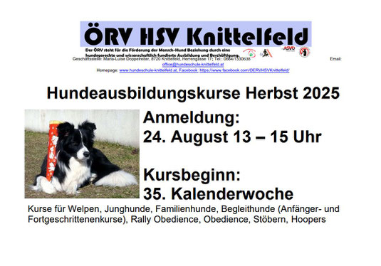 Achtung (Datumsänderung): Am 24. August 2025 von 13 bis 15 Uhr findet an unserer Hundeschule die Einschreibung für die Herbstkurse statt.